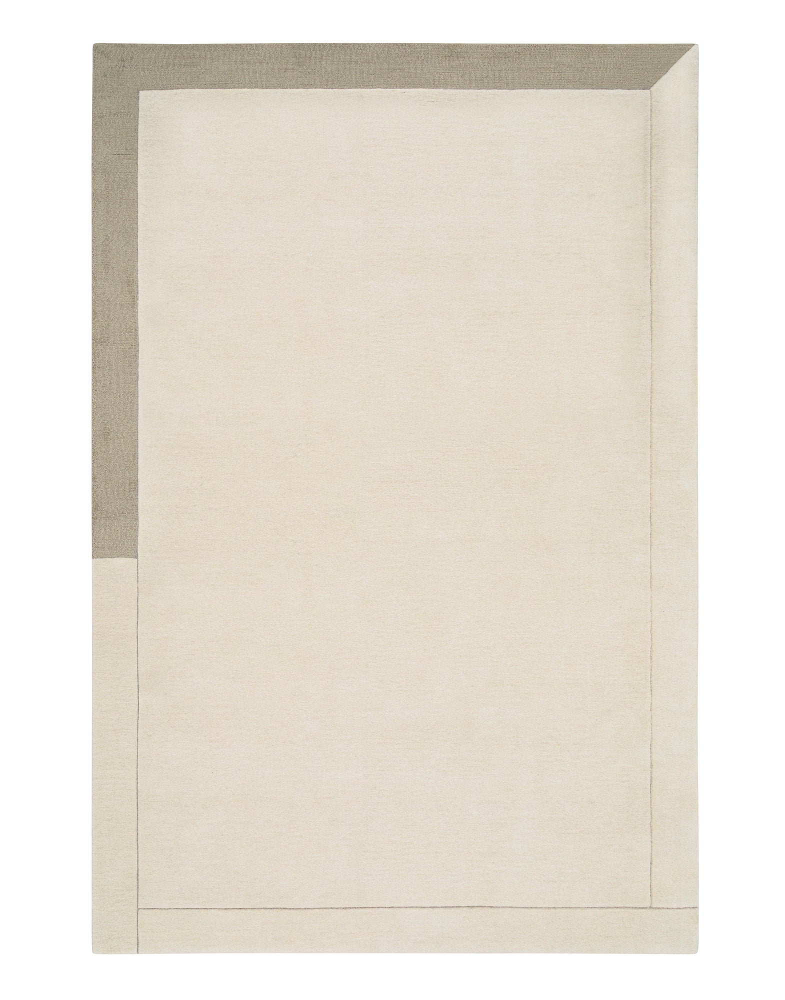 The natural white Geo One wool rug combines two shades of light tones, creating a subtle yet dynamic look. These tones, combined with wool as a material and the dense pile surface, give the rug a vibrant texture, further enhanced by a warm light gray loop texture framing the edges. The difference in height between the pile