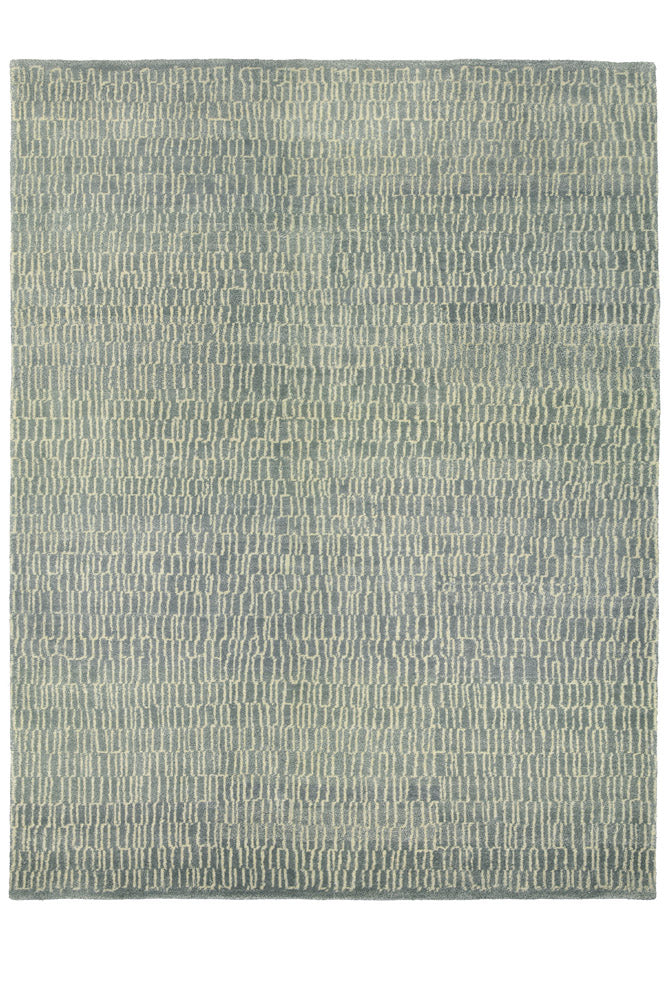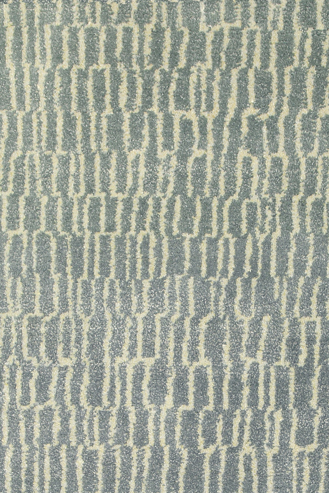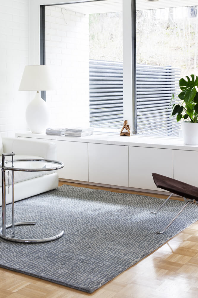 Ketju rug is designed by Ulla Koskinen. This hand-knotted rug is made of bamboo viscose and wool. The graphic design of the carpet brings a stunning visual element to the space and the soft and dense pile surface improves the room's acoustics. The rug has a beautiful greyish-blue color combined with a warm light shade pattern.